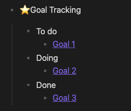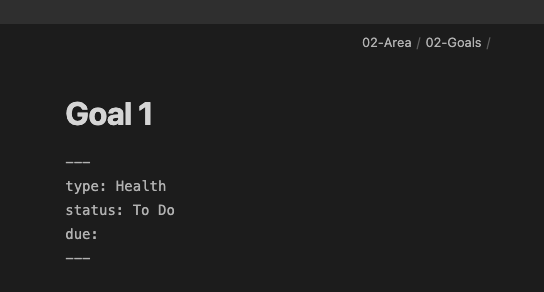1. Goal Note I create a note for each goal. I use YAML front matter to define the type of goal, status and due date. I use the statuses "To Do", "Doing", "Done", and "Later." These statuses help the dataview query to find goals and their status.